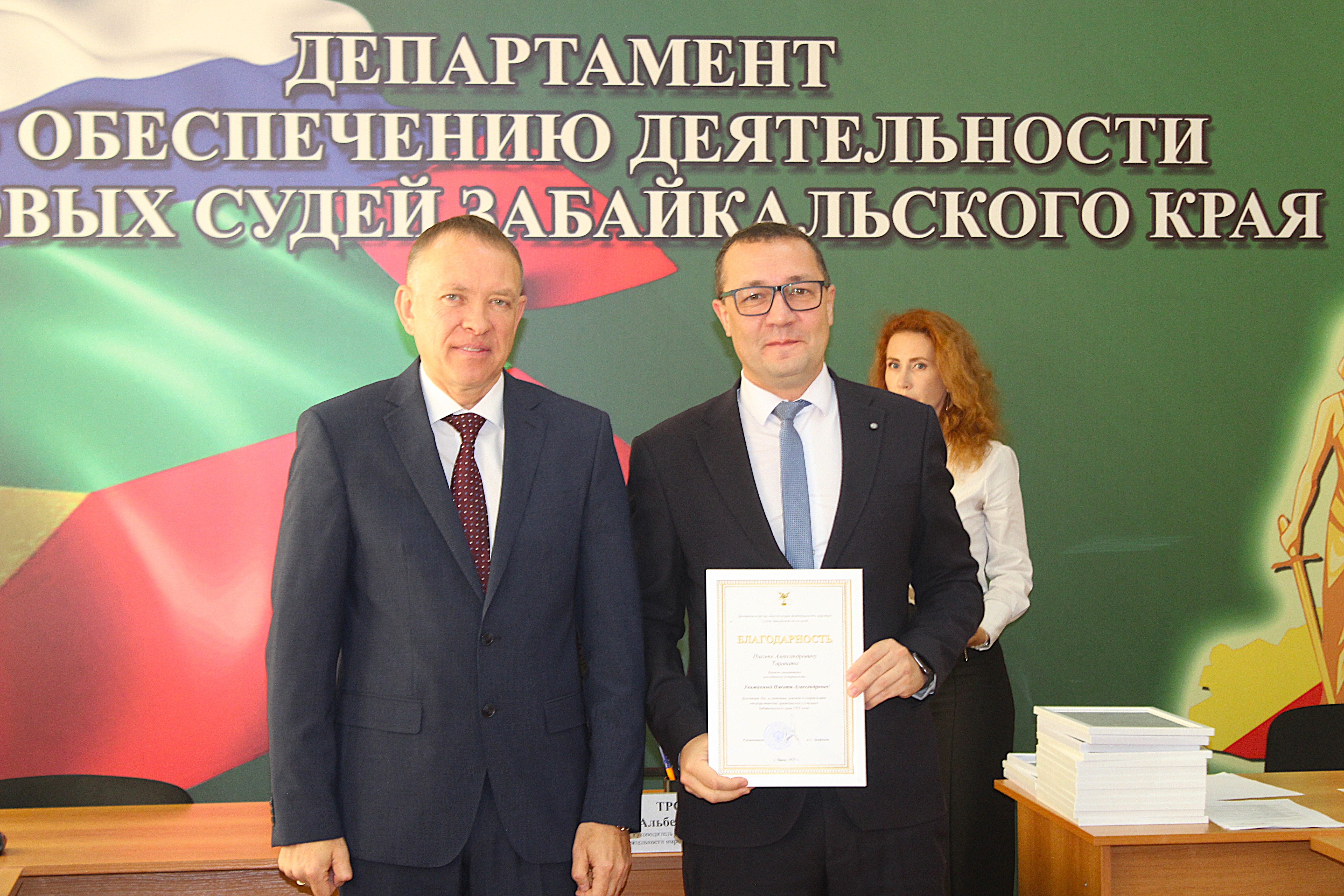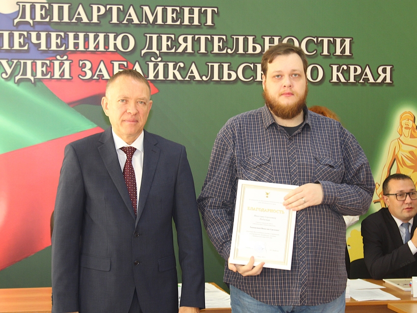 Стоит отметить, что само совещание началось с приятной и торжественной ноты — церемонии награждения. Руководитель Департамента Альберт Трофимов вручил благодарность Губернатора Забайкальского края старшему специалисту 1 разряда финансово-экономического отдела Надежде Крестьянниковой и помощнику мирового судьи судебного участка № 17 Ингодинского судебного района Ирине Томиловой за многолетний добросовестный труд и высокий профессионализм. Также были вручены Благодарности сотрудникам Департамента и аппарата мировой юстиции, которые достойно показали себя на ежегодной Спартакиаде государственных служащих.
