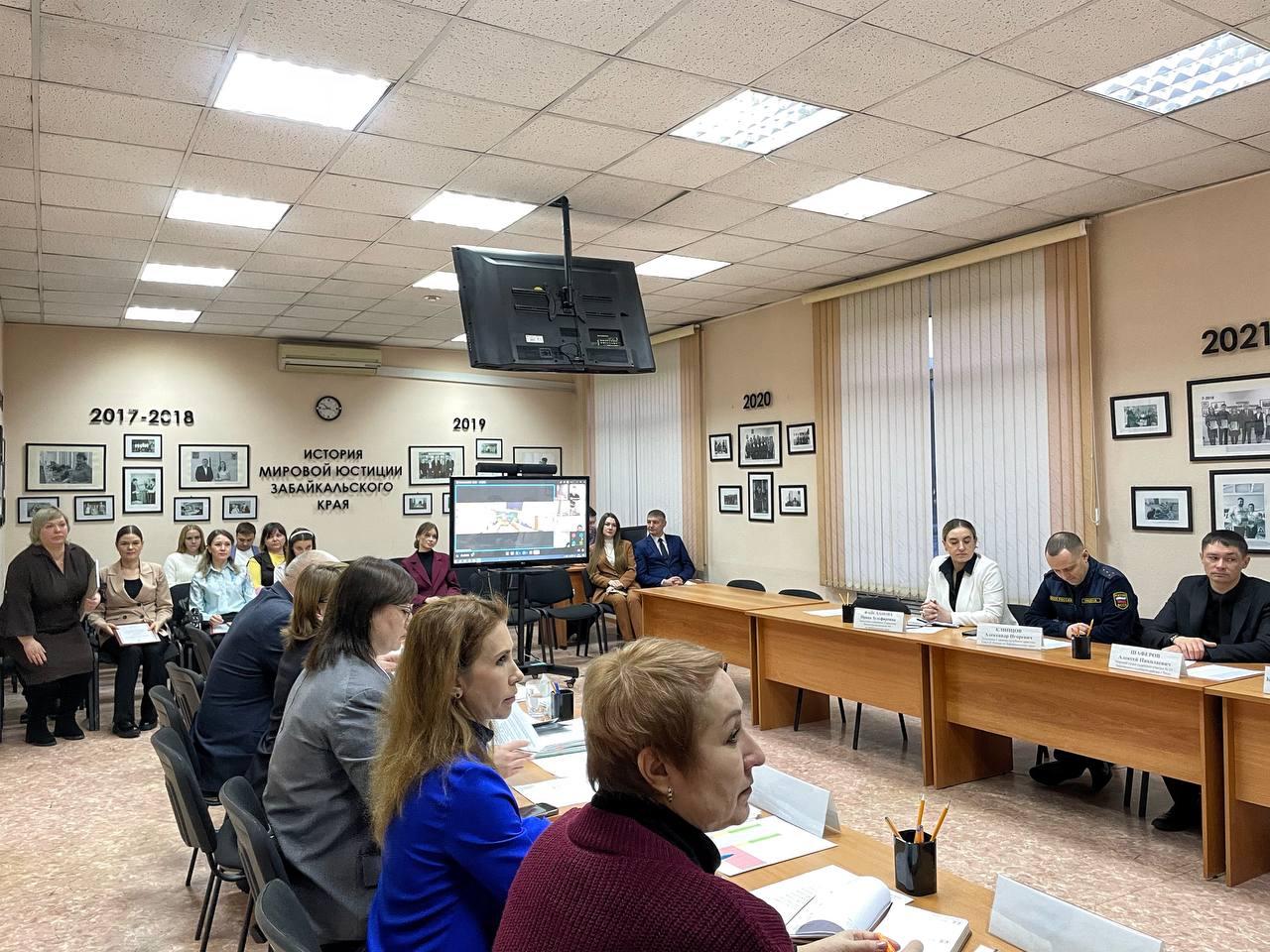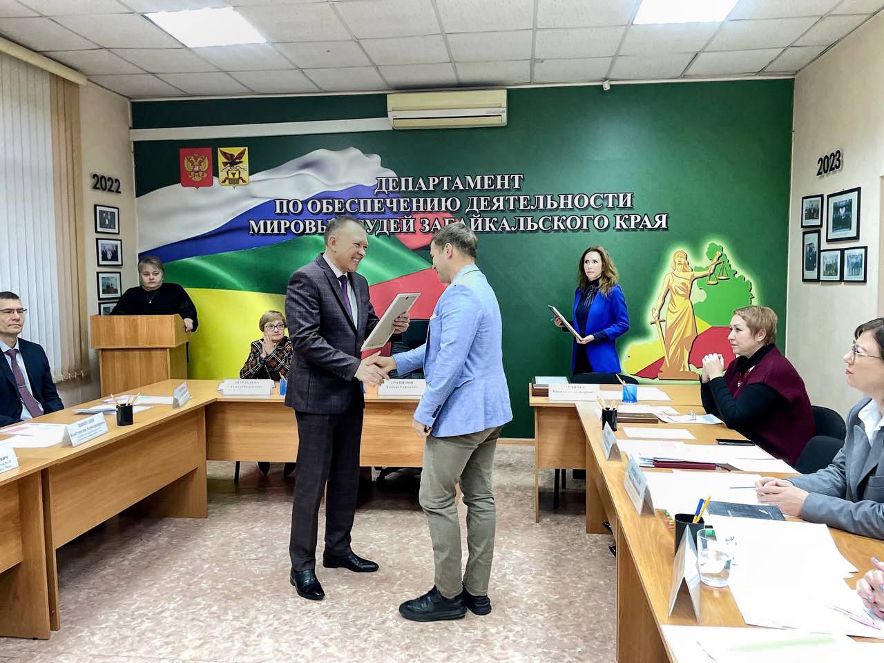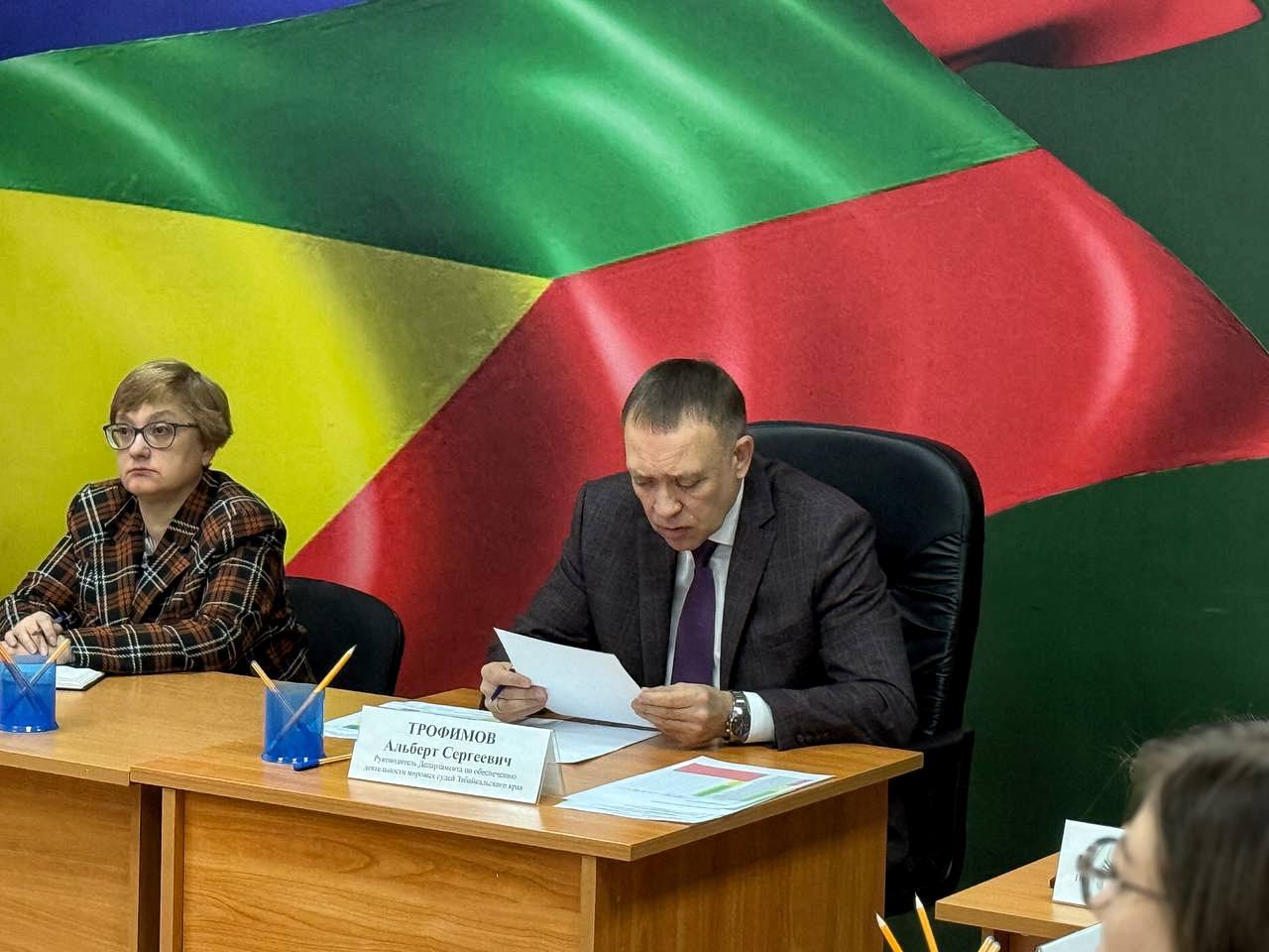 В совещании приняли участие заместитель председателя Забайкальского краевого суда Толстобров Александр Анатольевич, заместитель начальника Управления Министерства юстиции РФ по Забайкальскому краю Файсханова Ирина Зульфировна, помощник Главного судебного пристава УФССП России по Забайкальскому краю Клинцов Александр Игоревич, мировой судья судебного участка № 25 Черновского судебного района г.Читы Шаферов Алексей Николаевич, а также руководители отделов Департамента.
