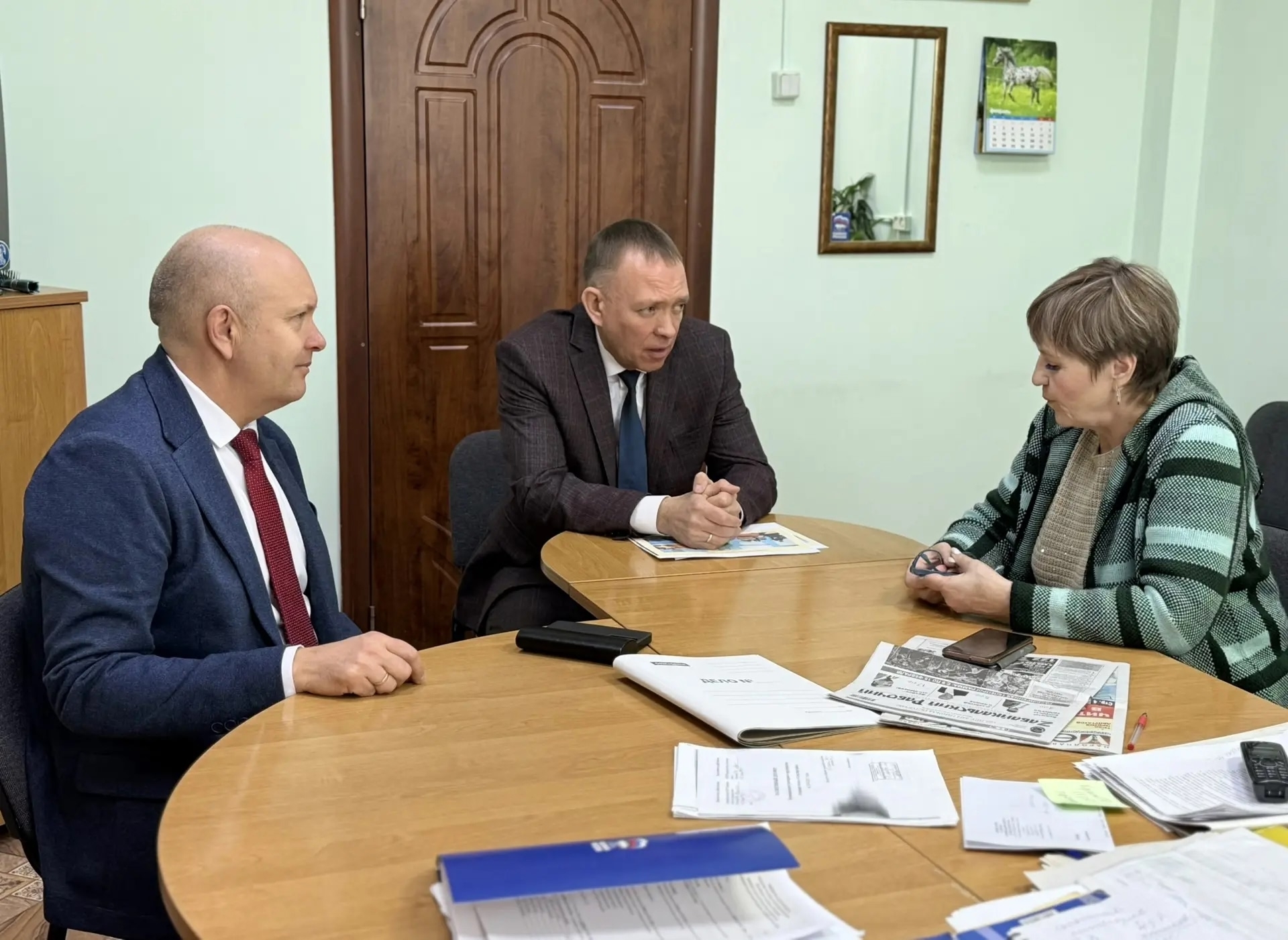 (на фото:Е.В.Ушаков и А.С.Трофимов в беседе с главным редактором Л.В.Ройгубиной в редакции газеты «Балейское обозрение»)