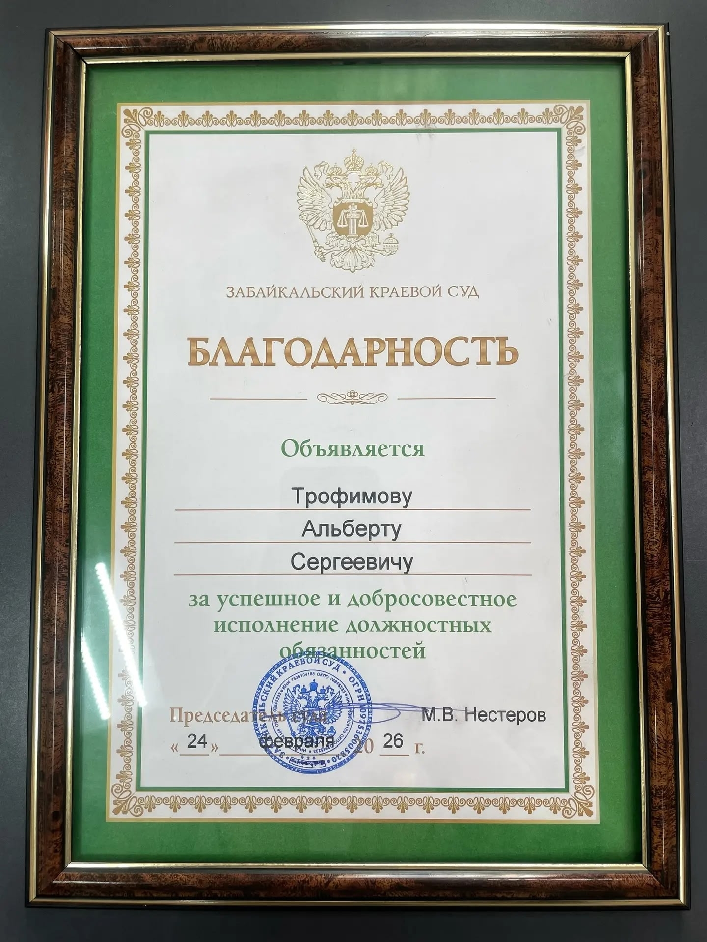 В рамках ежегодного совещания судей руководитель Департамента Альберт Трофимов был удостоен Благодарности Забайкальского краевого суда за успешное и добросовестное исполнение должностных обязанностей. Кроме того, подведены итоги профессионального конкурса на звание «Лучший помощник мирового судьи, лучший секретарь судебного заседания, лучший секретарь суда судебных участков мировых судей Забайкальского края».
